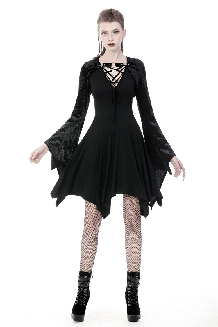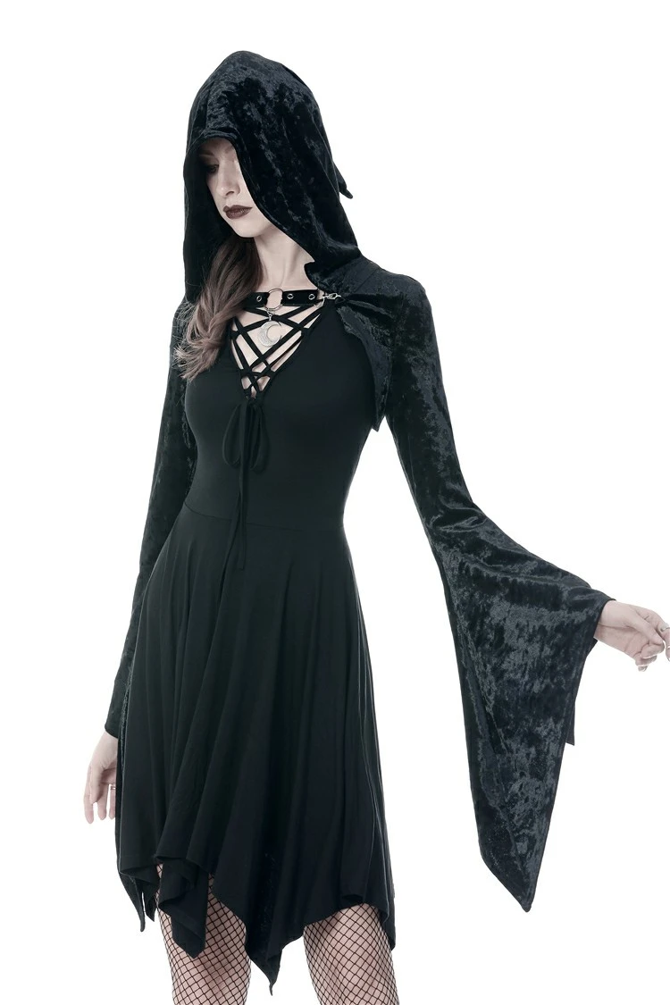Petit boléro à capuche en velours noir corbeau aux reflets légèrement brillants