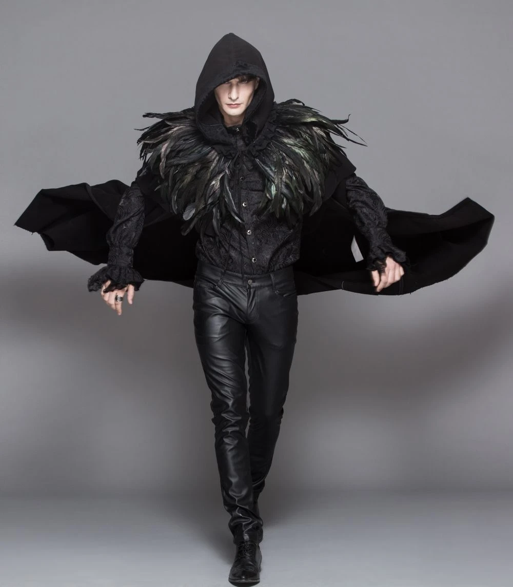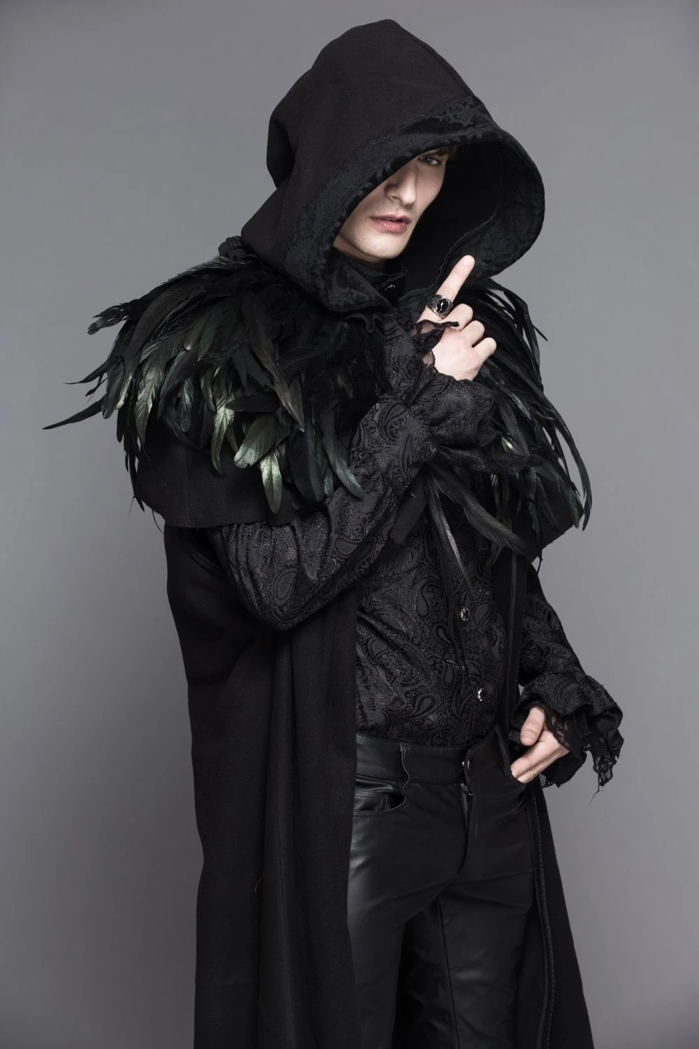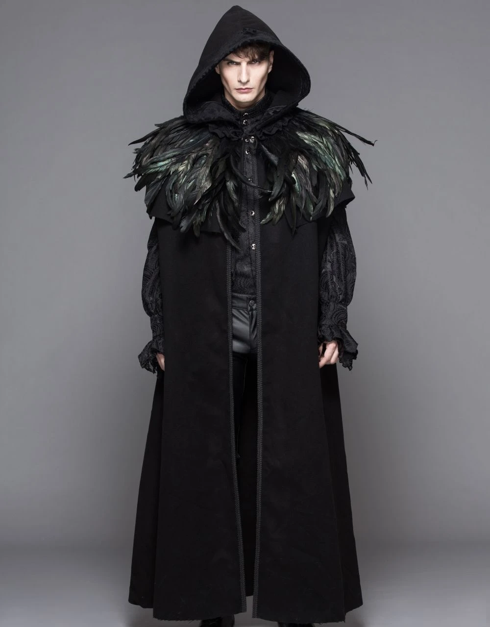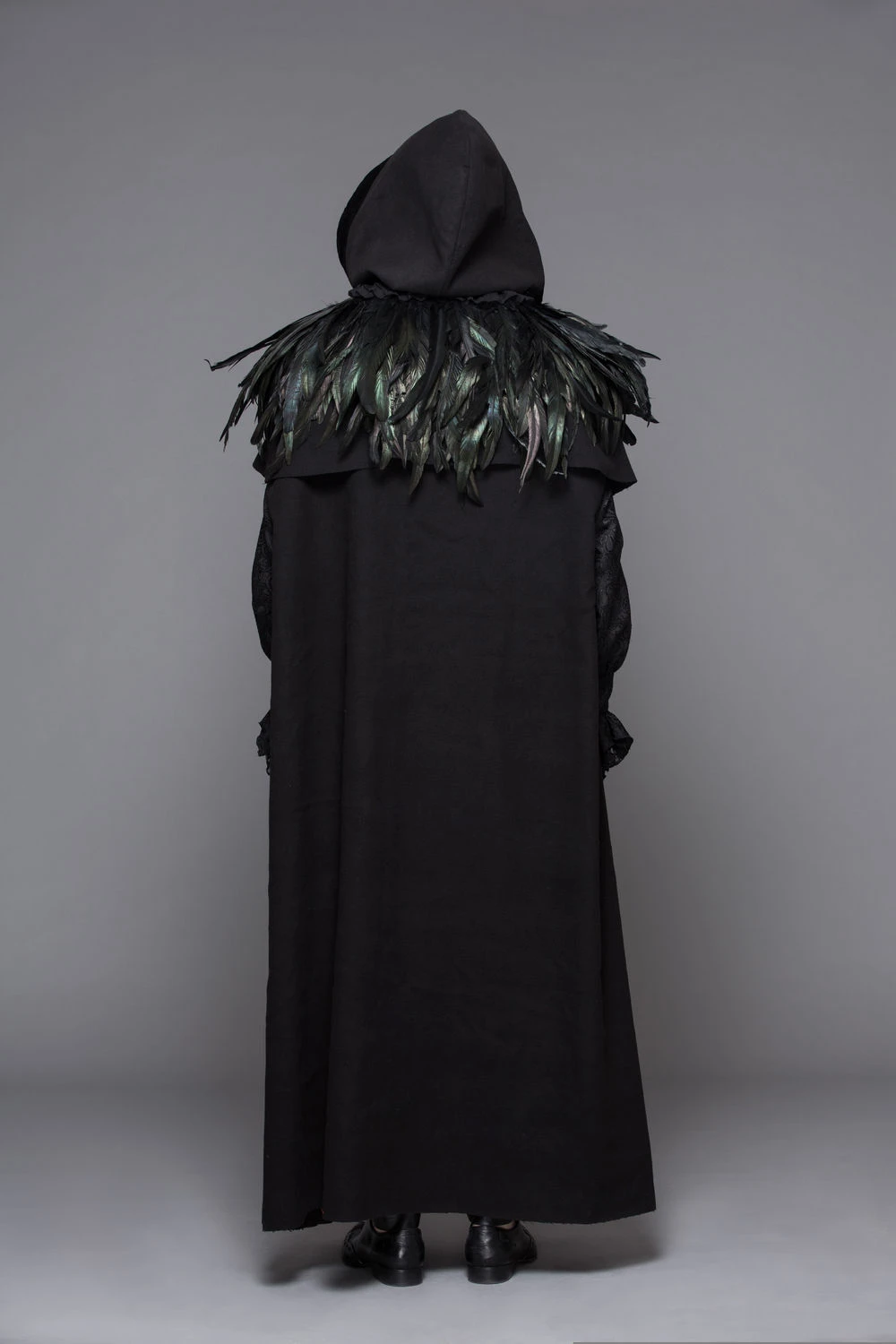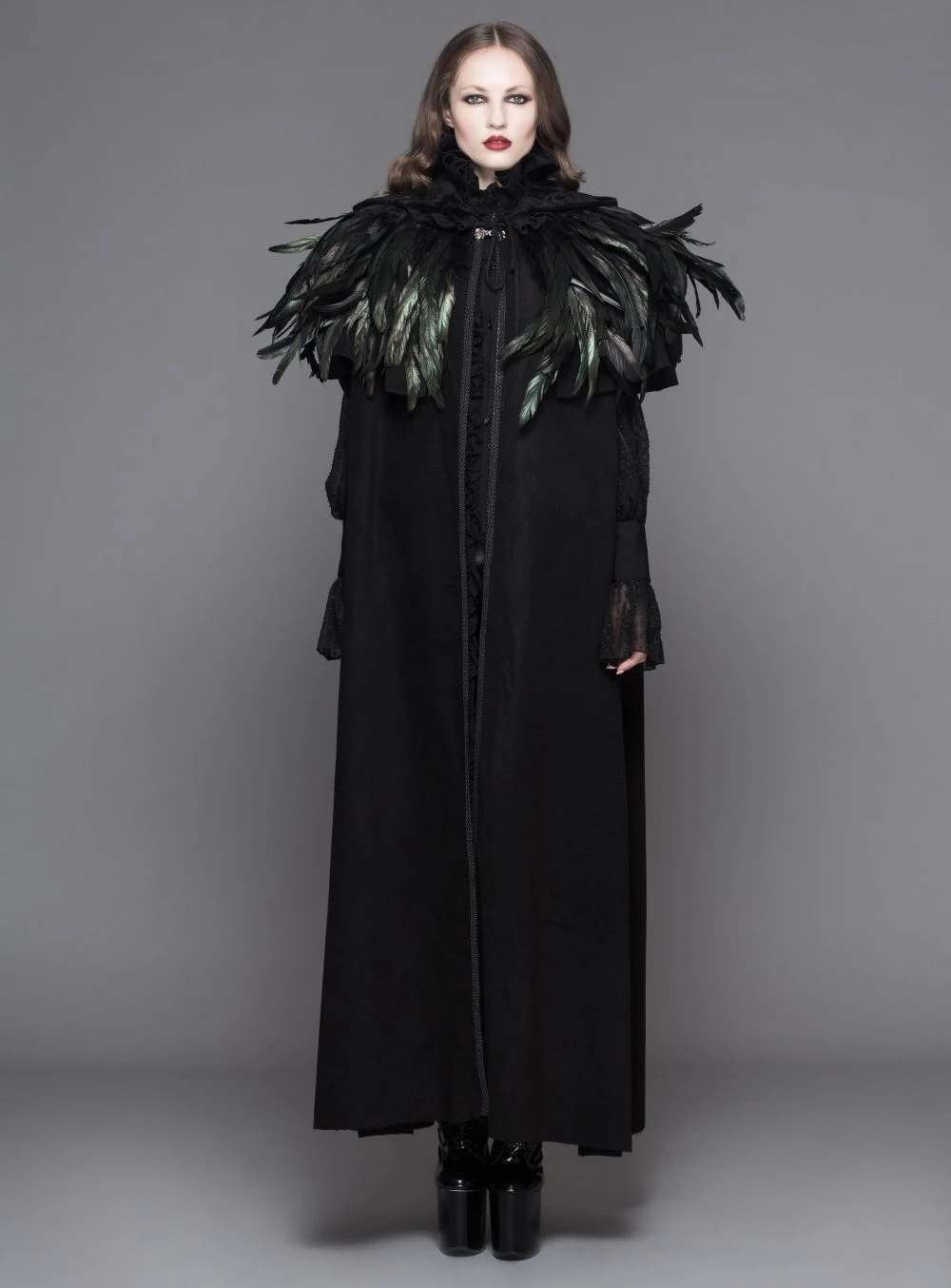 Grande cape gothique en tissu polaire de très belle qualité, sa chauffeuse amovible faite de plumes noires aux reflets verdâtres lui donne un style hors du commun