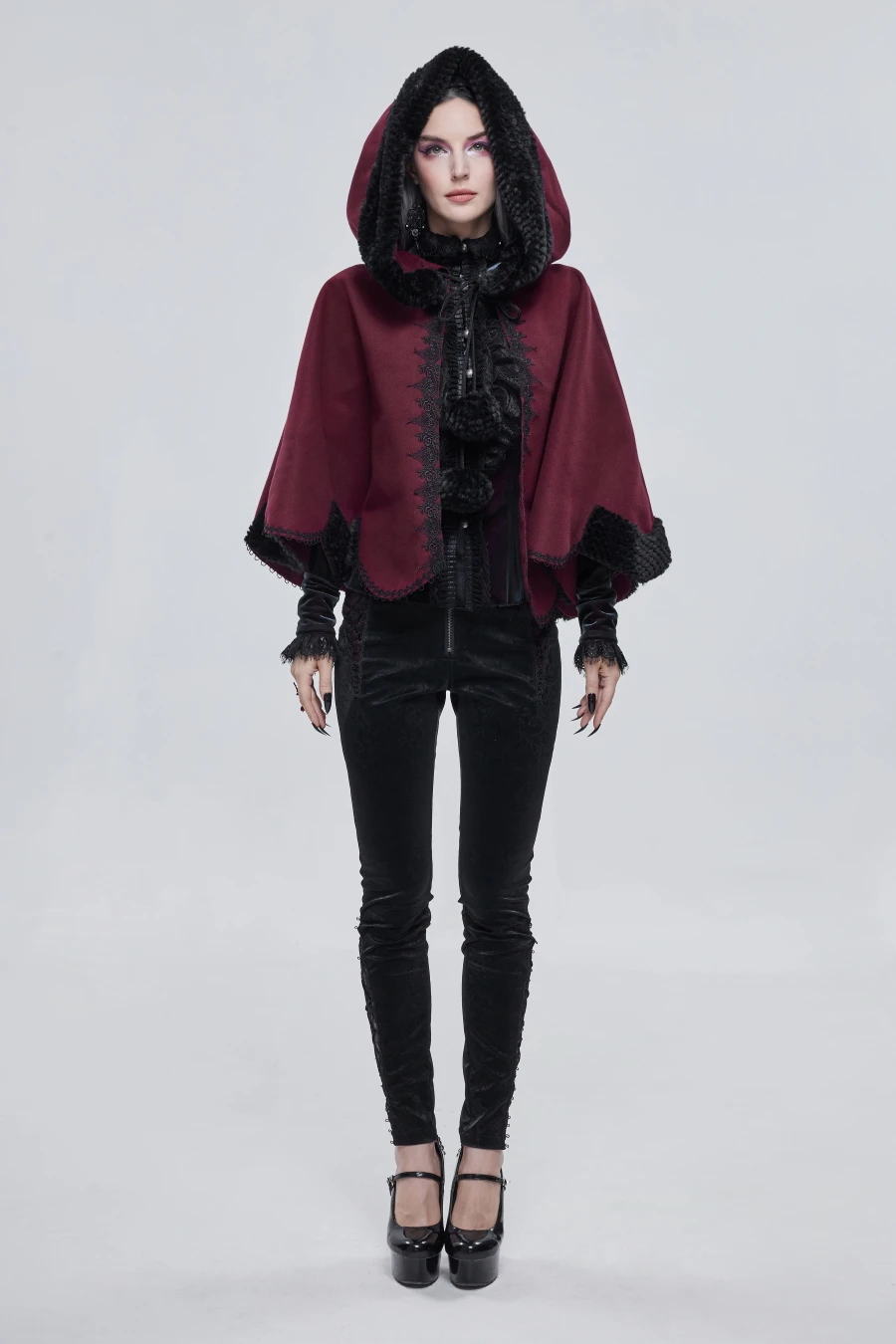 Elle est agrémentée de fausse fourrure noire en bordure de capuche et au bas de la cape
