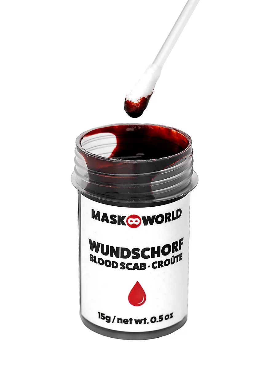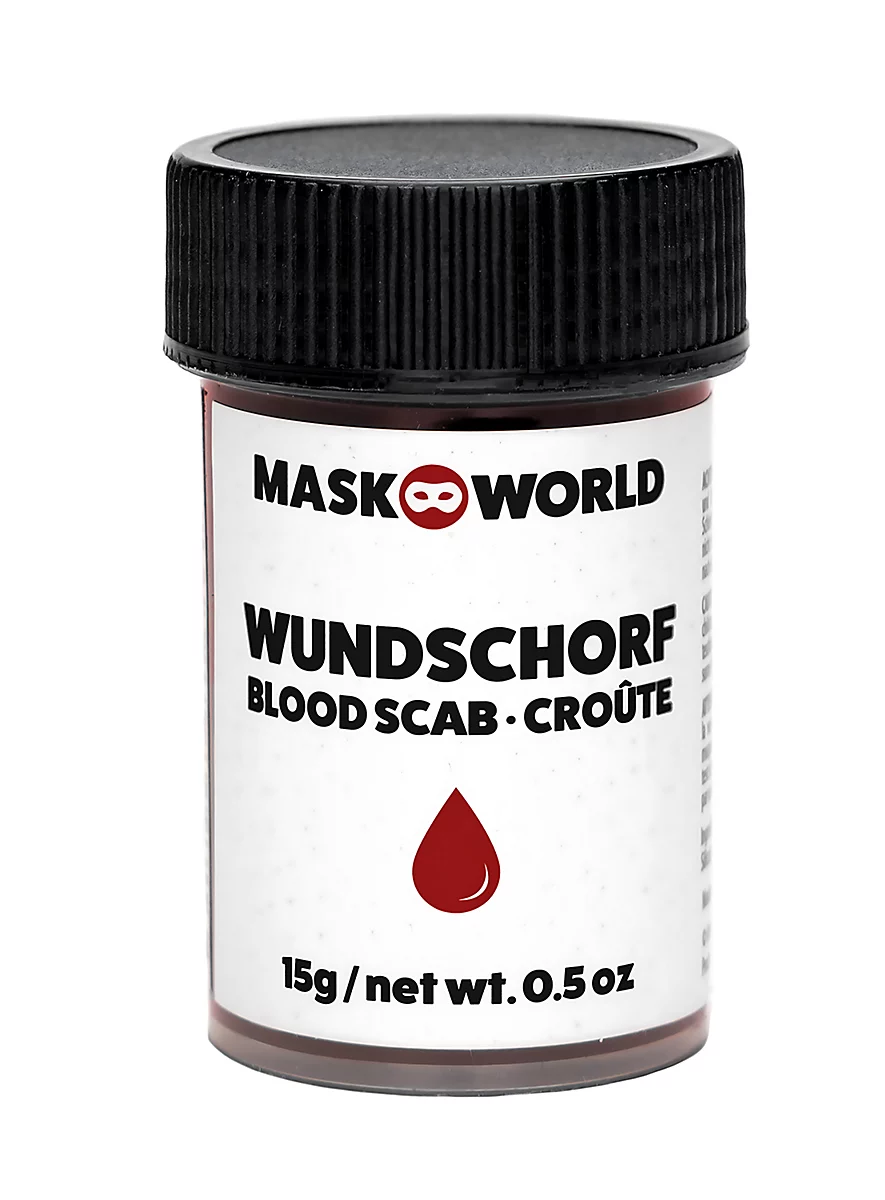 (Attention : ne pas utiliser le gel effet croûtes à proximité des yeux ou sur les yeux ! Le sang risque de laisser des tâches indélébiles sur certains tissus et surfaces. Ne pas utiliser à proximité d’un tapis ou d’un meuble rembourré. Les enfants de moins de 10 ans peuvent utiliser ce produit uniquement sous la surveillance d’un adulte. Ne pas utiliser en cas d’allergie à l’un des composants indiqués.)