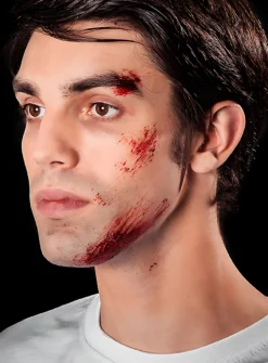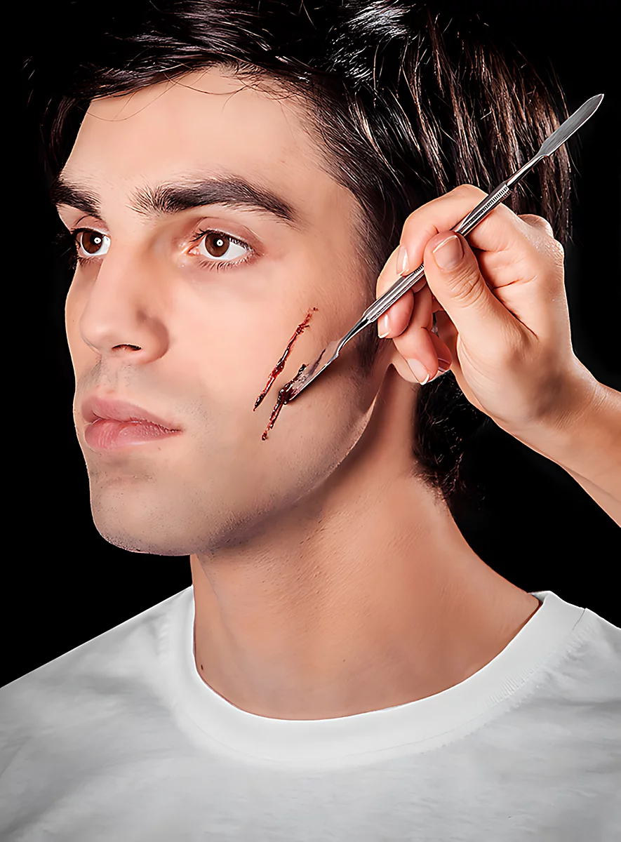 Le gel effet croûtes permet de remplir efficacement toutes les (fausses) plaies profondes. L’appliquer avec un cure-dent ou un pinceau fin dans le creux de la blessure. Pour les coupures ou les piqûres, faire dépasser le gel de l’application et l’appliquer sur la peau normale. La blessure aura ainsi l’air plus naturelle.