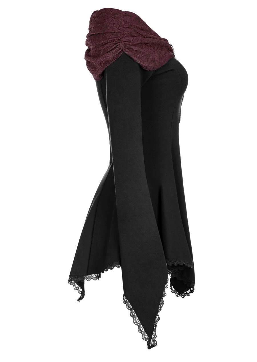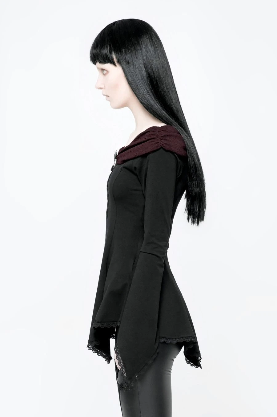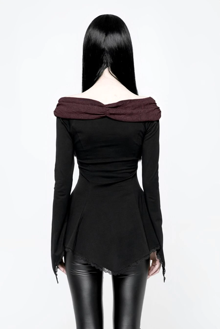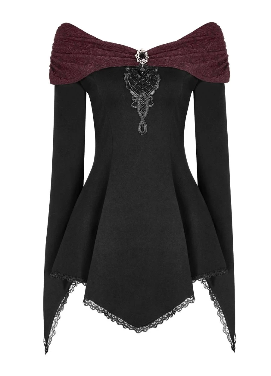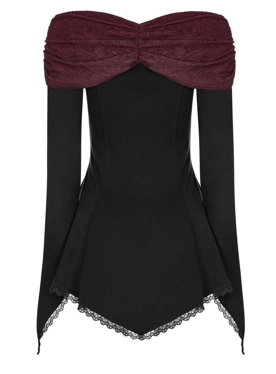 La grande classe ! Ce haut gothique de style victorien Ă manches longues est agrĂ©mentĂ© d’une large encolure bordeaux faite dans un superbe tissu lĂ©gĂšrement gauffrĂ©