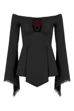 Il est agrémenté d’un original empiècement au dessus de la poitrine avec un cercueil en velours bordeaux et une croix gothique en métal noir, l’ensemble est bordé de broderie et appporte la touche mystérieuse qui fait toute la différence