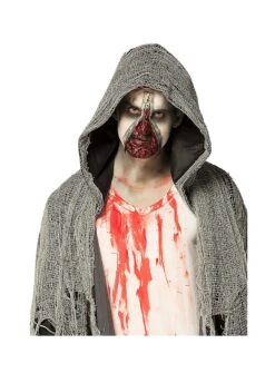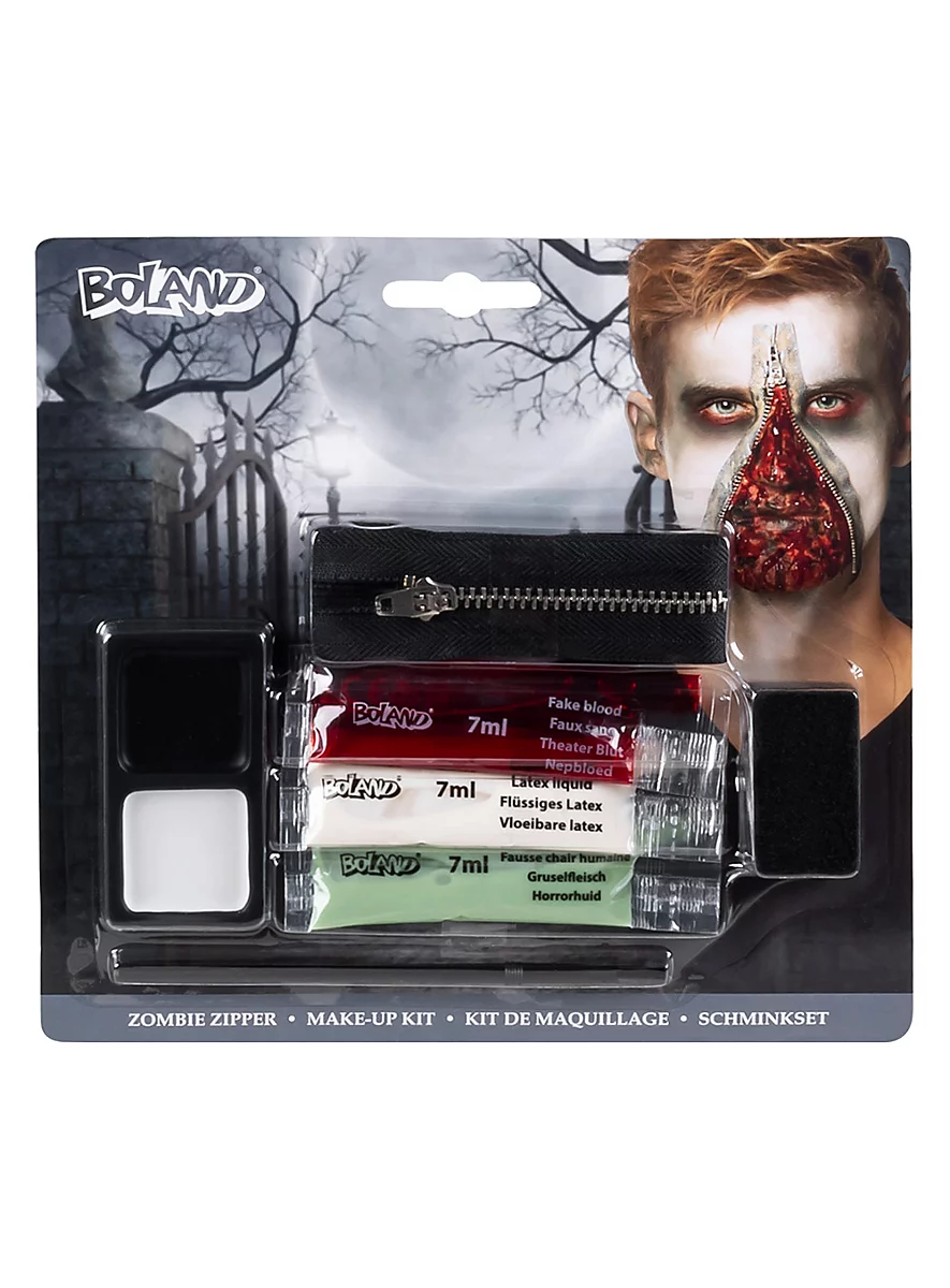 - avec du maquillage noir et blanc, du faux sang, du latex liquide, une peau d’horreur, une éponge et une fermeture éclair