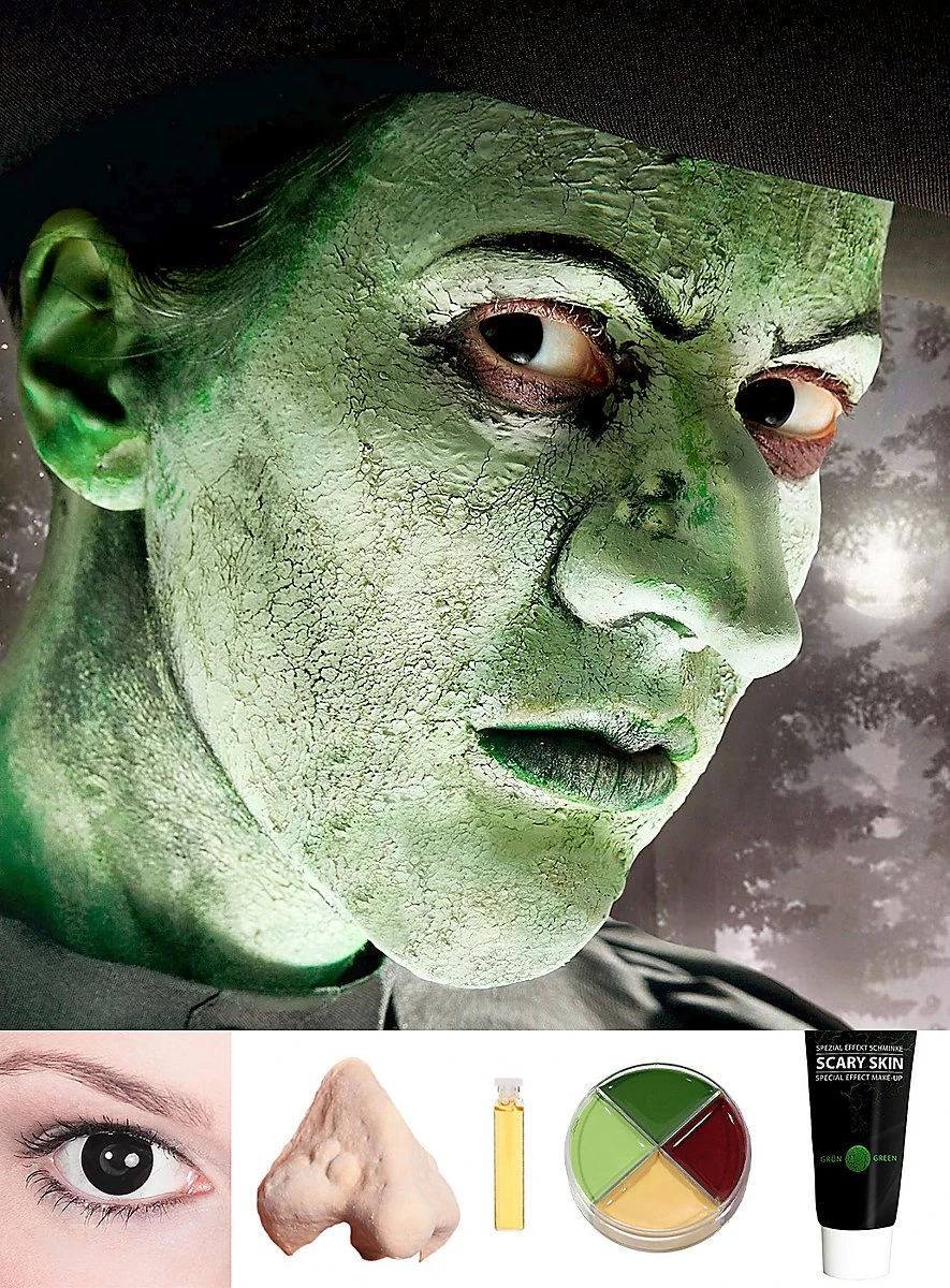 Contact Lenses : soft colored contact lenses (58 % Polyhema, 42 % H2O) in buffered saline solution. Scary Skin green : Aqua, Bentonite, Propylene Glycol, Methylparaben, Propylparaben, Imidazolidinyl Urea, CI 77004, CI 77891, CI 77288. Mastix Spirit Gum & Nose : Mastix spirit gum (2ml) : Alcohol Denat., Copal, Colophonium (Rosin), Glycol Rosinate, Fumaric Acid. Prosthetic made of latex.Cream Make-up : Paraffinum Liquidum (Mineral Oil), Laneth -40, Paraffin, Candelilla Cera (Euphorbia Cerifera (Candelilla) Wax), Oleth-10, Petrolatum, Carnauba (Copernicia Cerifera (Carnauba) Wax), Hexyl Laurate, Cera Alba (Beeswax), Cetyl Palmitate, Lanolin Alcohol, Tocopherol, Propylene Glycol, BHT, Cetearyl Alcohol, Asorbyl Palmitate, Glyceryl Stearate, Citric Acid, Parfum (Fragrance) and may contain : (+/- Titanium Dioxide CI 77891, Iron Oxides CI 77491, CI 77492,CI 77499, Red 7 CI 15850, Red 36 CI 12085, Ultramarines CI 77007, Ferric Ferrocyanide CI 77510, Chromium Oxide Greens, CI 77288, Yellow 5 Lake CI 19140, Chromium Hydroxide CI 77289, Red 40 Lake CI 16035, Blue 1 Lake CI 42090, Carmine CI 75470, Bronze or Copper Powder CI 77400, Aluminium Powder CI 77000, Yellow 6 Lake CI 15985, Red 21 Lake, CI 45380, Red 27 Lake CI 45410, Manganese Violet CI 77742, Bismuth Oxychloride CI 77163, Red 30 CI 73360, Mica), (EU only : CI 11680, CI 77266, CI 58000, CI 77120, CI 74160, CI 73015)