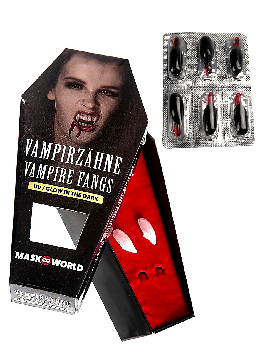 - avec deux dents de vampire lumineuses (Glow in the Dark)
