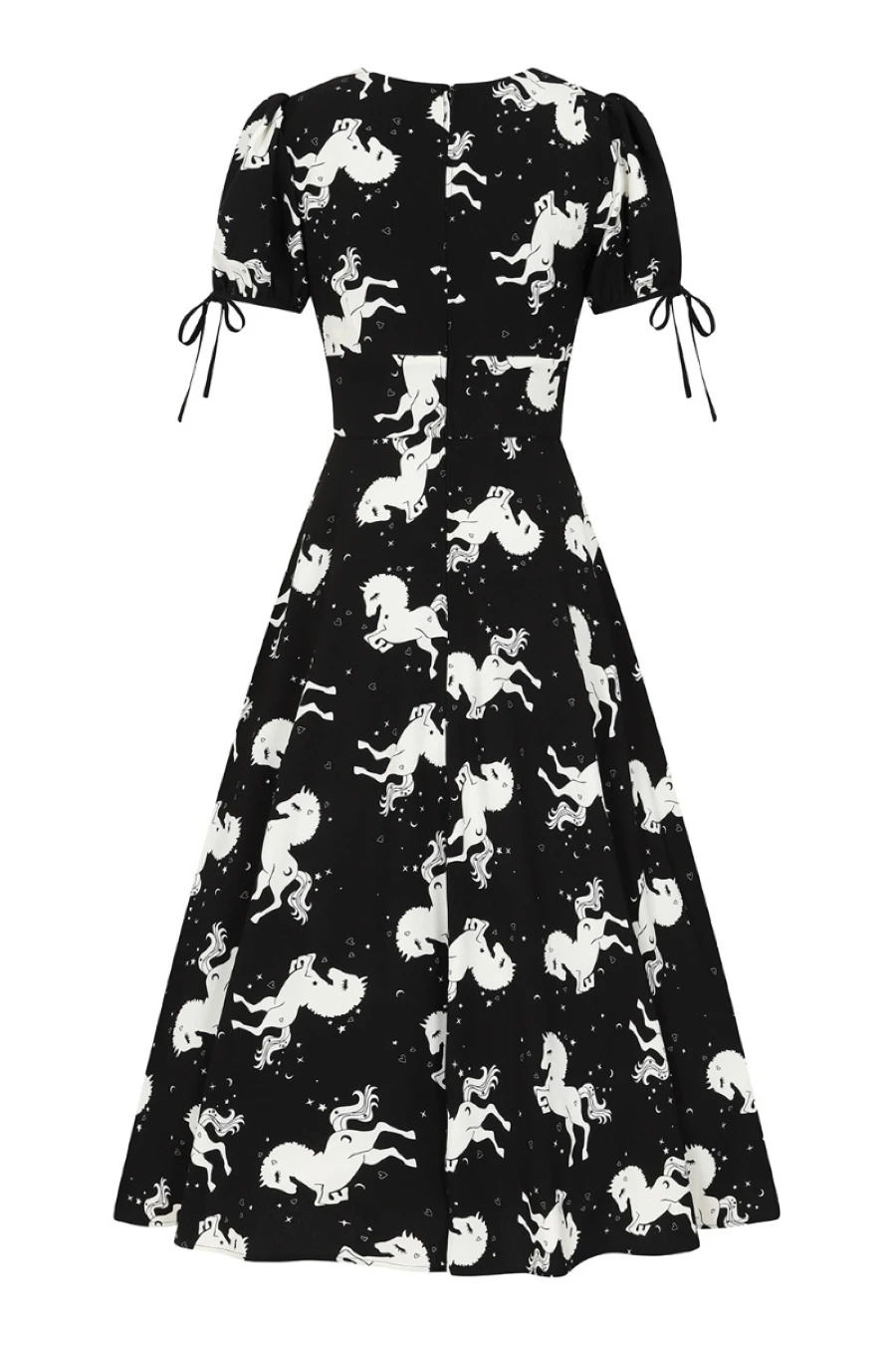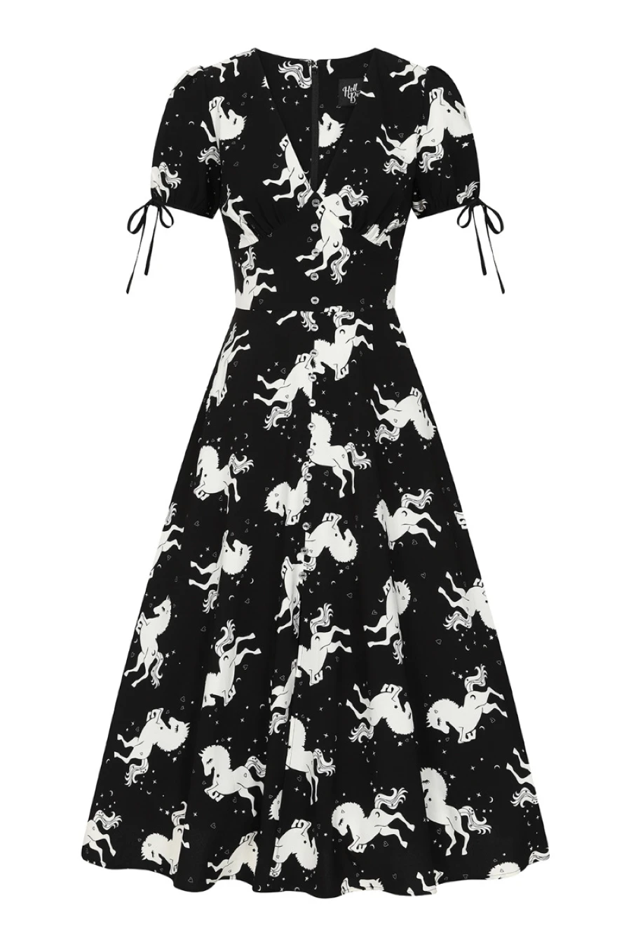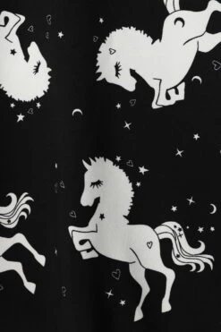 Cette belle robe noire signée Hell Bunny possÚde un imprimé de licornes dans un pur esprit Fantasy