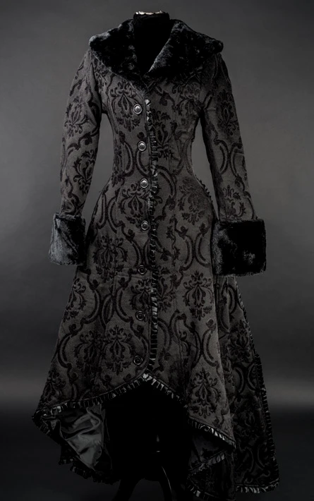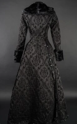 Long manteau gothique evil princesse taillé dans un magnifique tissu brocarde aux motifs baroques en velours