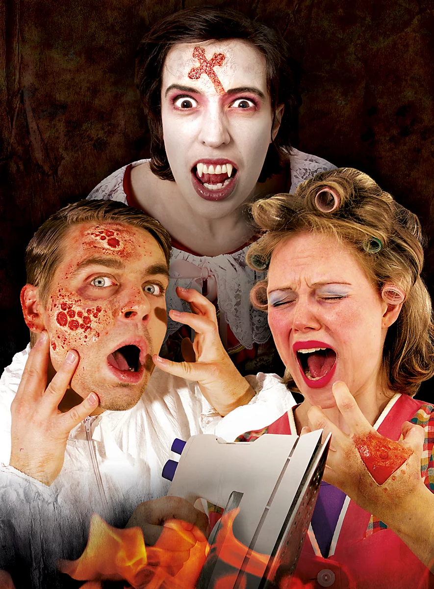 Grâce à notre maquillage crème « brûlures », vous pourrez réaliser facilement et rapidement des brûlures réalistes et des écorchures. Le maquillage convient particulièrement bien pour recouvrir l’une de nos applications en latex ou pour être appliqué sur notre peau « effet horreur ». Le maquillage crème « brûlures » s’enlève très facilement avec de l’eau chaude et du savon ou une lotion nettoyante. Cette technique permet également d’éliminer le maquillage en poudre.