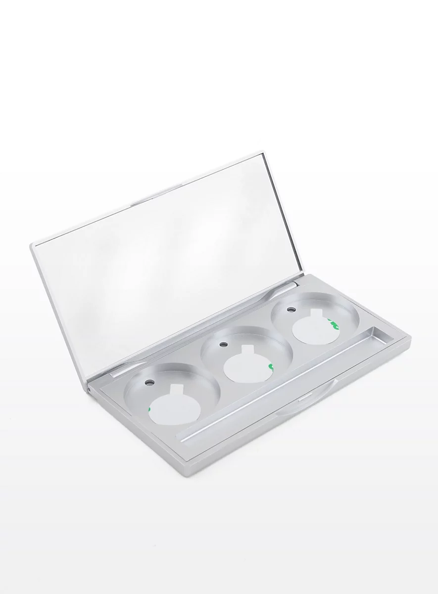 La palette Trio-Set de Kryolan est idéale pour créer sa propre combinaison de couleurs individuelles à partir de trois ombres à paupières ou rouges Kryolan. Les godets (réservoirs de couleur) sont simplement collés au moyen de pads autocollants dans l’écrin stable et sont donc conservés en sécurité. Le couvercle est muni d’un miroir pratique qui est toujours à portée de main, il y a aussi une place pour un petit pinceau ou applicateur.