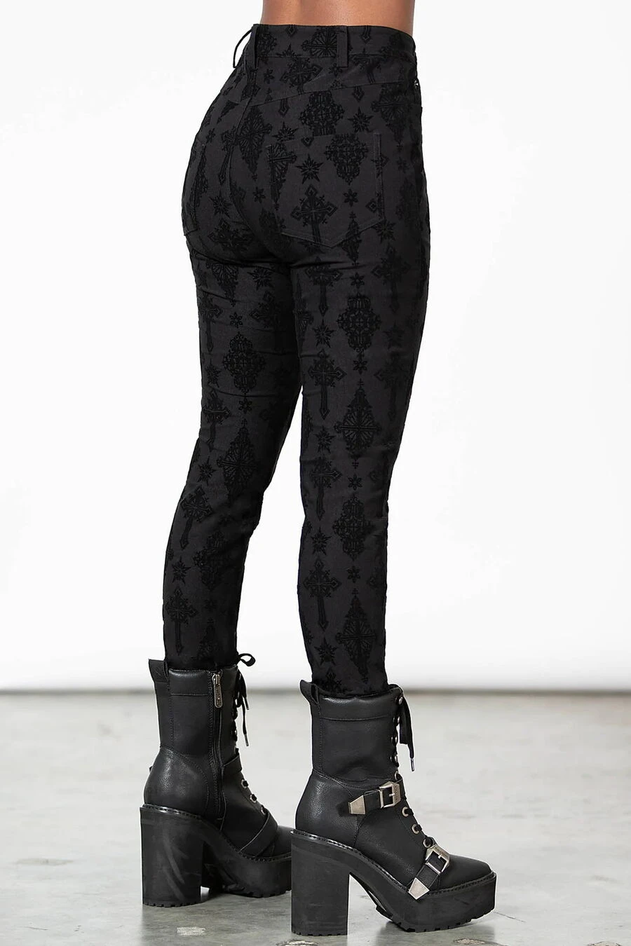 Le tissu est floqué de croix gothiques et motifs baroques en velours pour un pur look goth