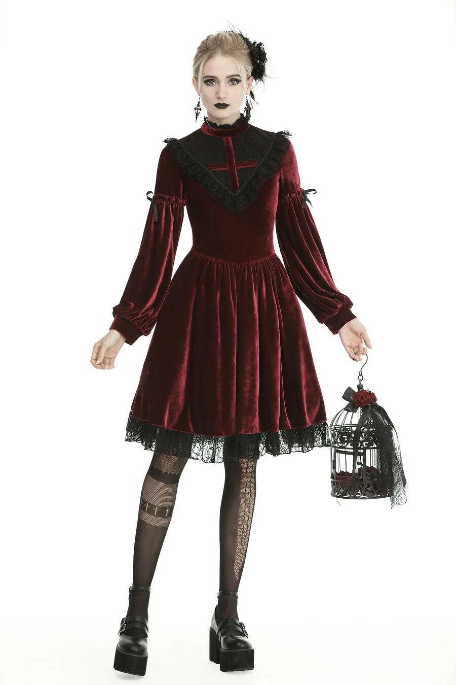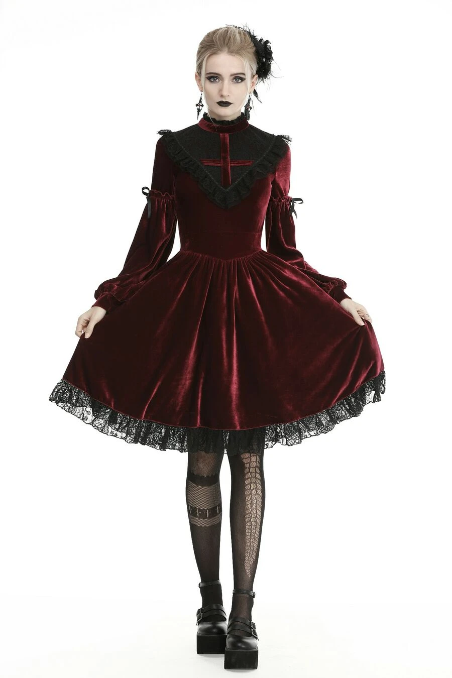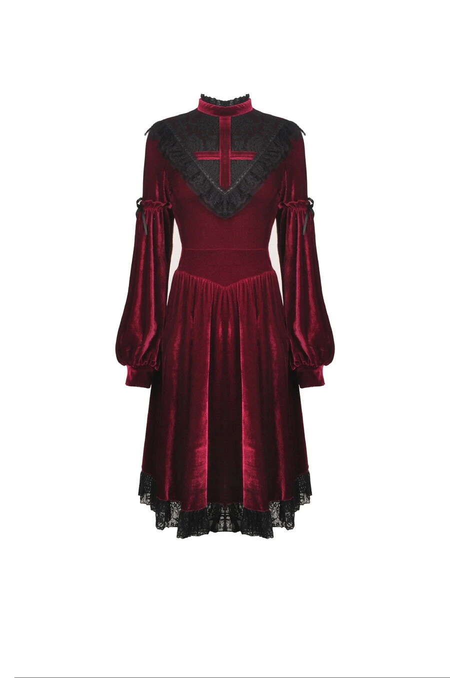 Elle est agrĂ©mentĂ©e d’une partie haute en V en fine dentelle noire avec une grande croix gothique en velours