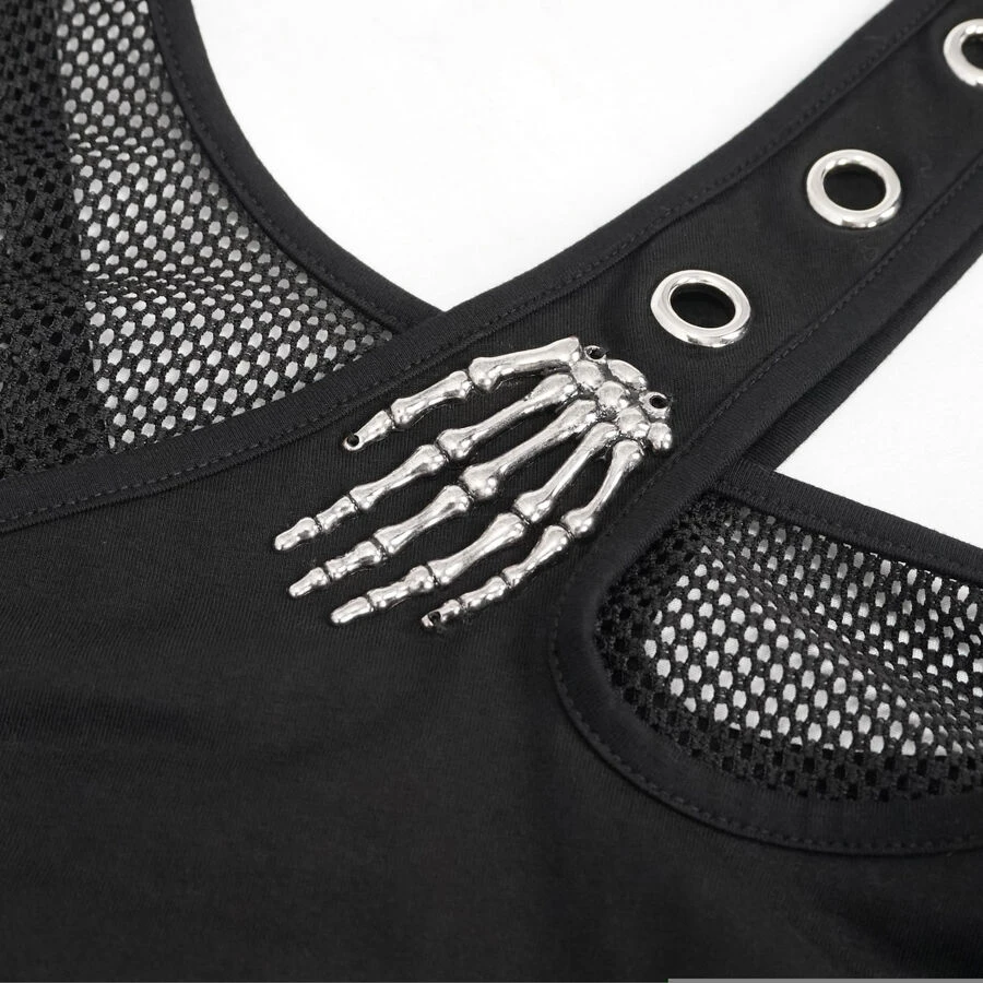 Double bretelles Ă gauche dont l’une est agrĂ©mentĂ©e de gros oeillets et d’une grande main de squelette en mĂ©tal