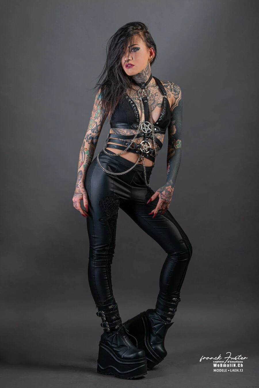 Vous aimez le look de notre mannequin ? Nous vous proposons la totale avec le leggings, les bottes compensées, le harnais ainsi que la ceinture